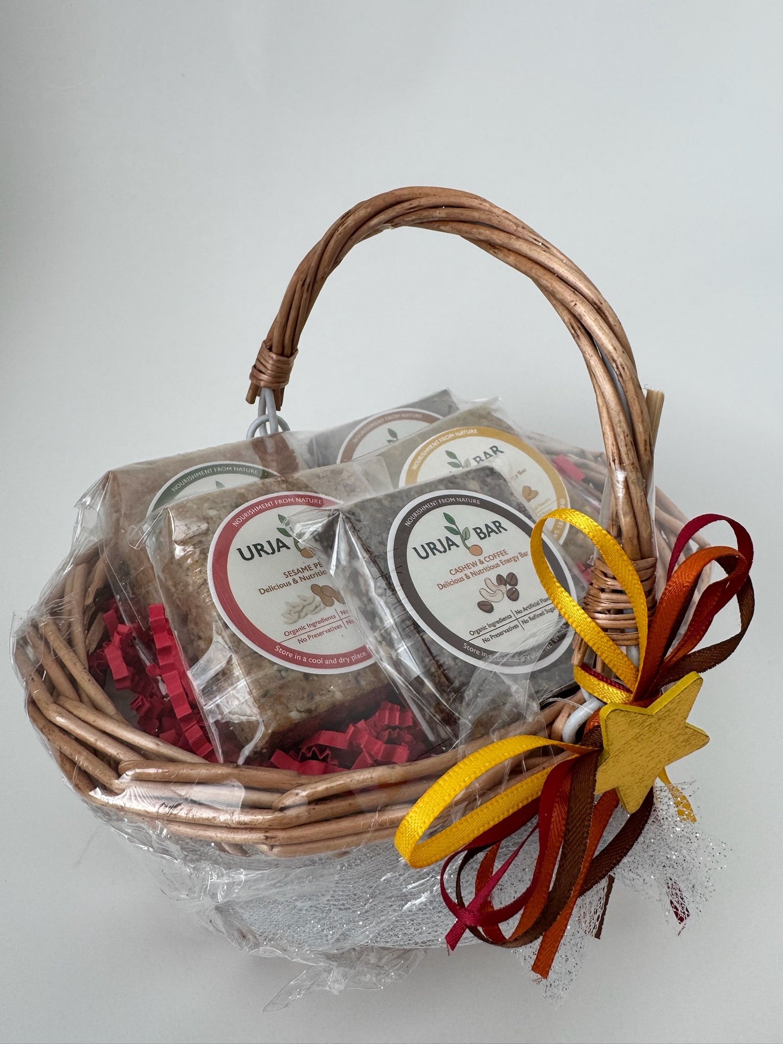 The gift pack includes 5 Urja bars (1 each of Date & Chocolate bars, Sesame Pepita, Sprouted Oats bars, Cashew & Coffee and Turmeric Chai). It comes with a basket.